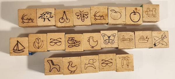Vintage Wood Engraved Letter Number Pictures Blocks Toys Lot of 22