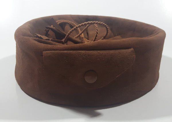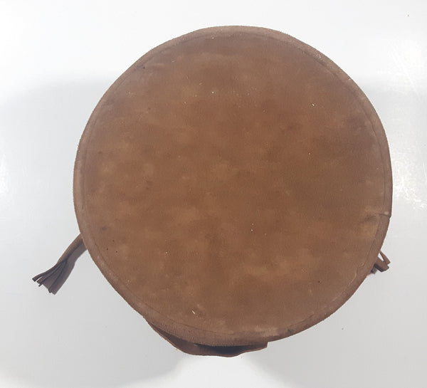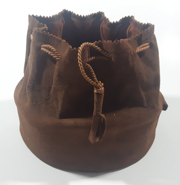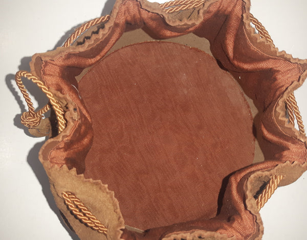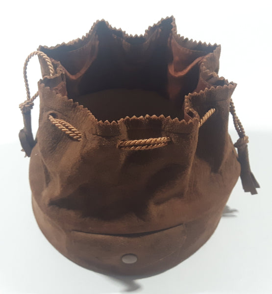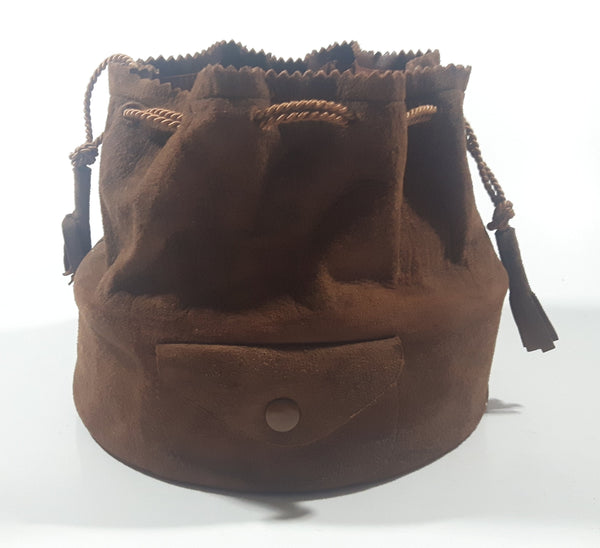 Vintage 1960s Brown Suede Drawstring Wood Bottom Bucket Shaped 7" Purse Hippie Bag
