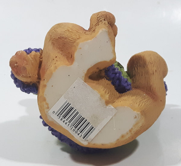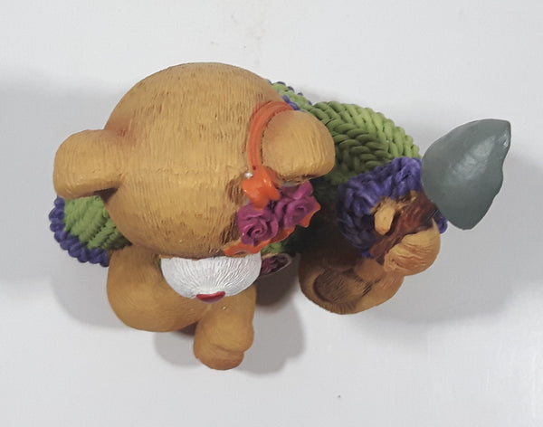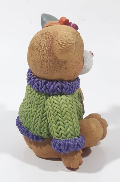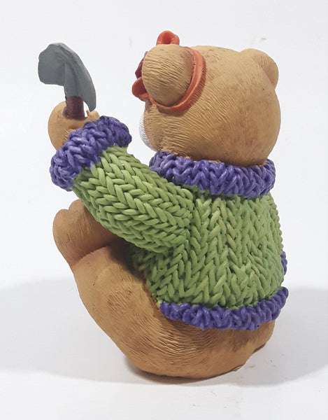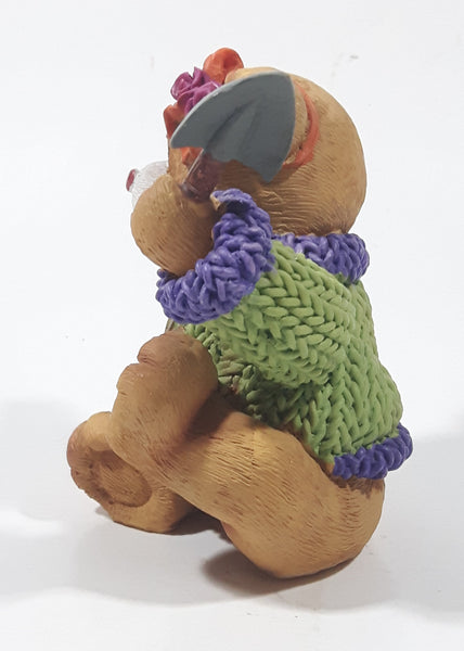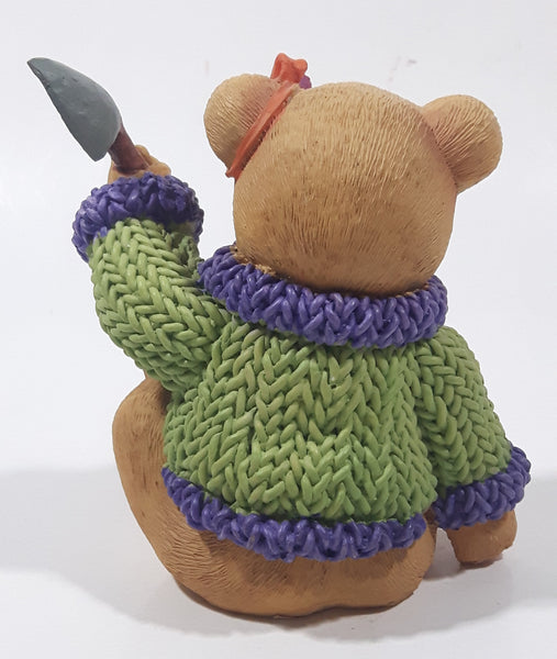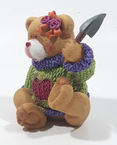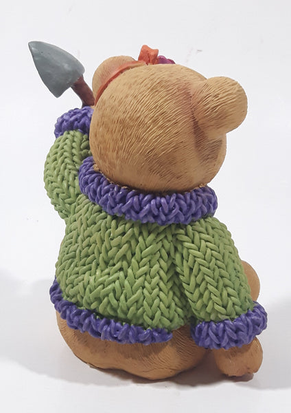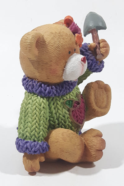 Brown Teddy Bear in Green Purple Sweater with Apple Design Holding Spade Shovel 4" Tall Hand Painted Ceramic Ornament