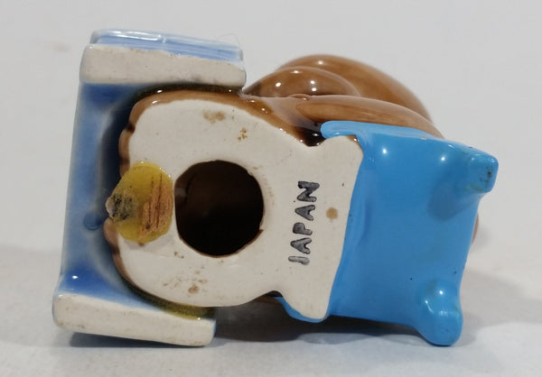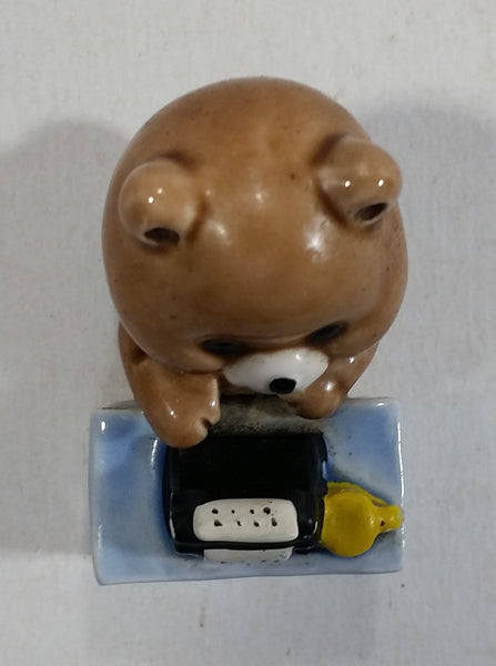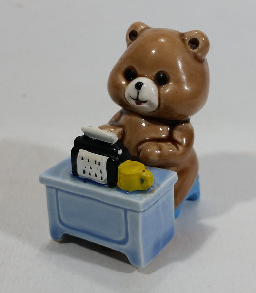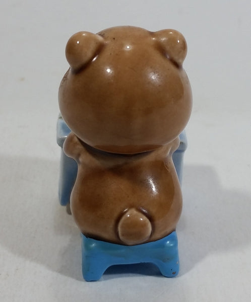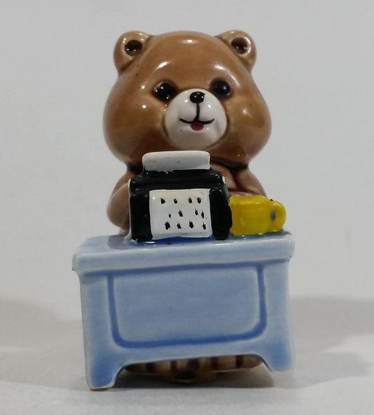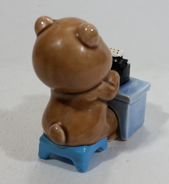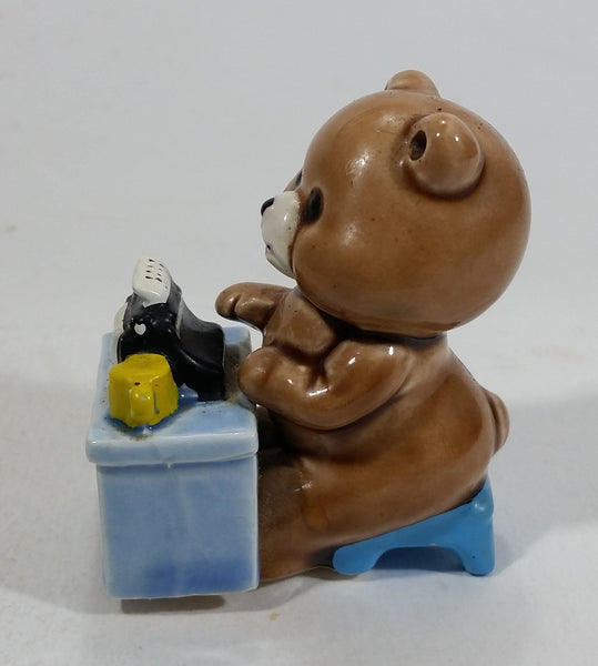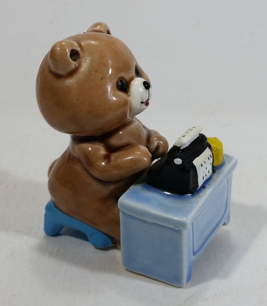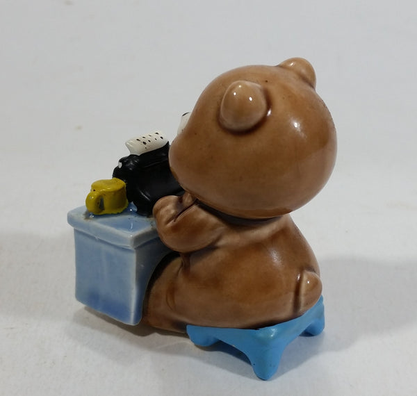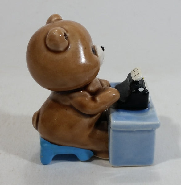 Cute Brown Bear Typing on Black Typewriter While Sitting At A Blue Desk Ceramic Figurine Made in Japan