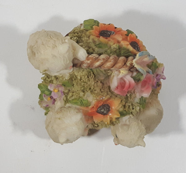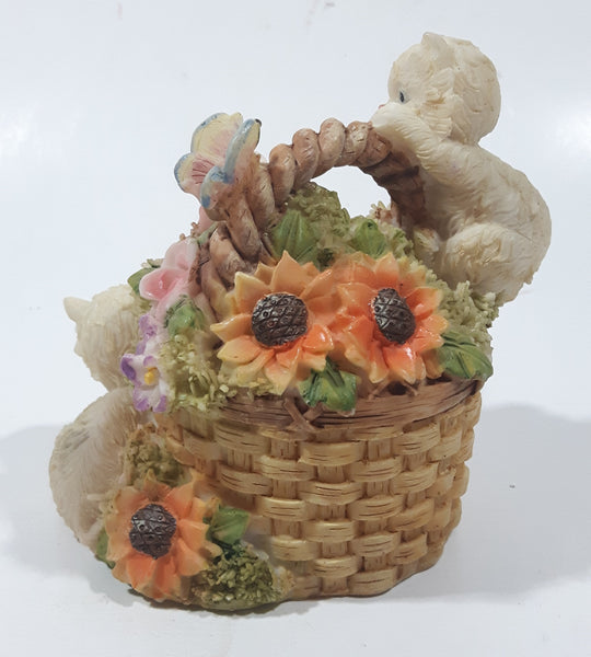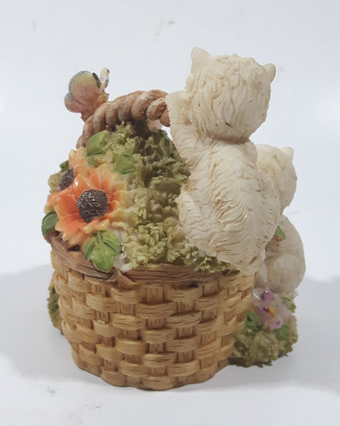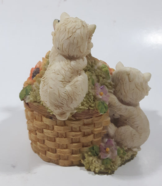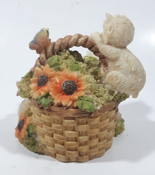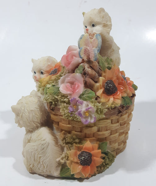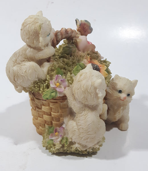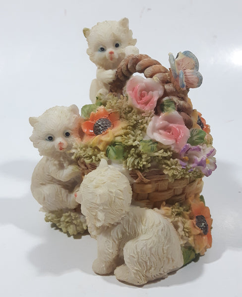 Three White Cats Climbing on Flower Basket with Butterfly on Handle 4" Tall Resin Figurine