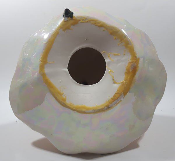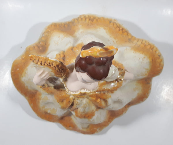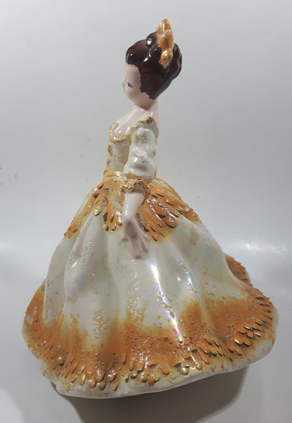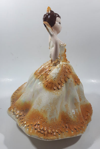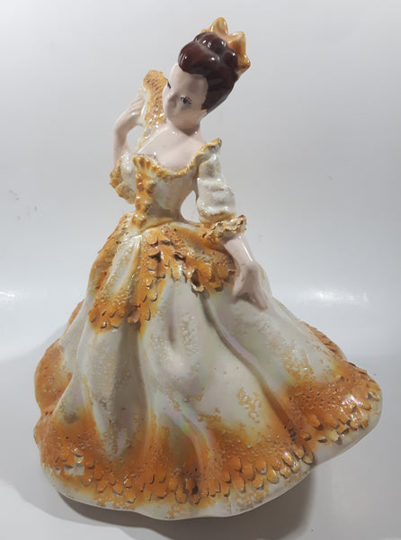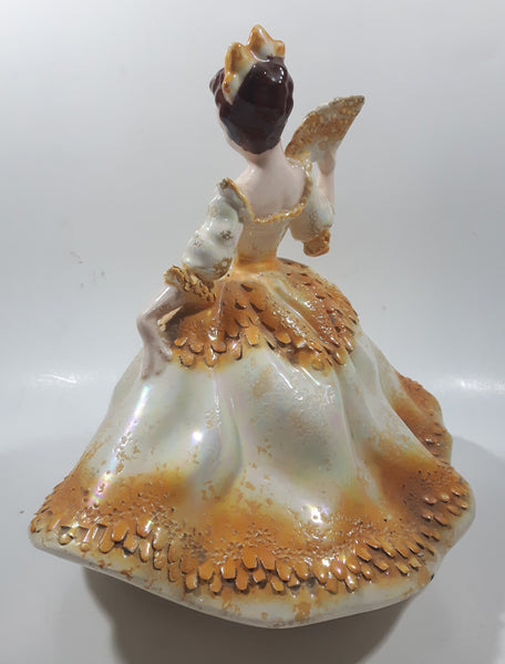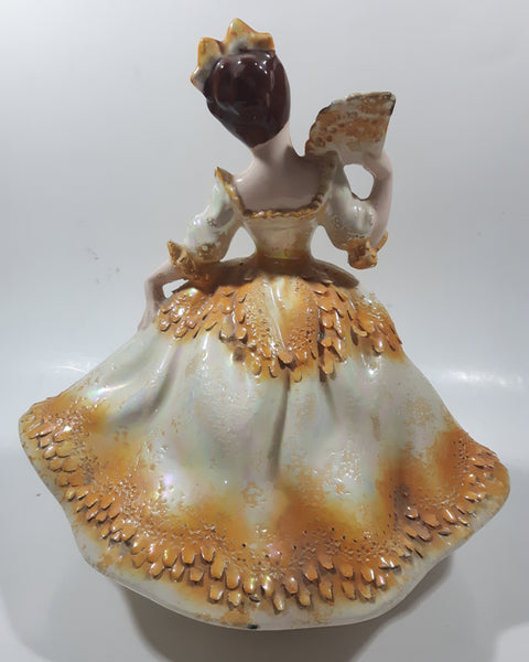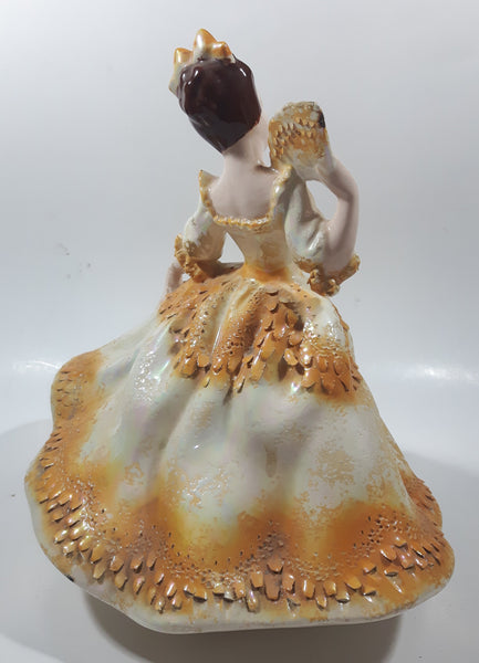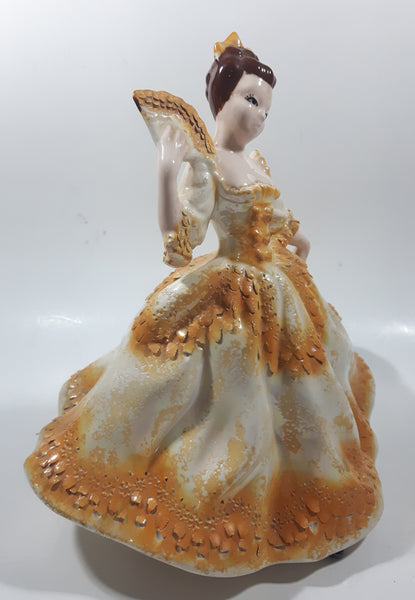 Vintage LJ Lady Jane with Hand Fan White and Orange Yellow Frilled Hand Painted 9 1/2" Tall Ceramic Figurine Statue