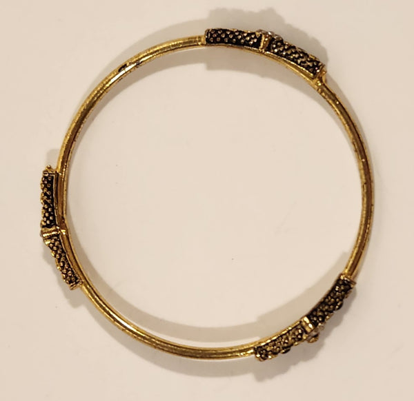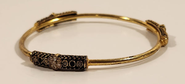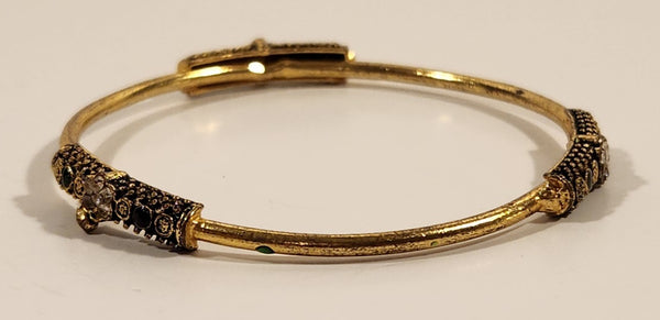 Clear Rhinestone Flower Pattern Green Gemstone Gold Tone Metal Bangle Bracelet