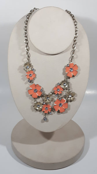 Pink Enamel Flowers Clear Plastic Rhinestone 16" Long Metal Necklace
