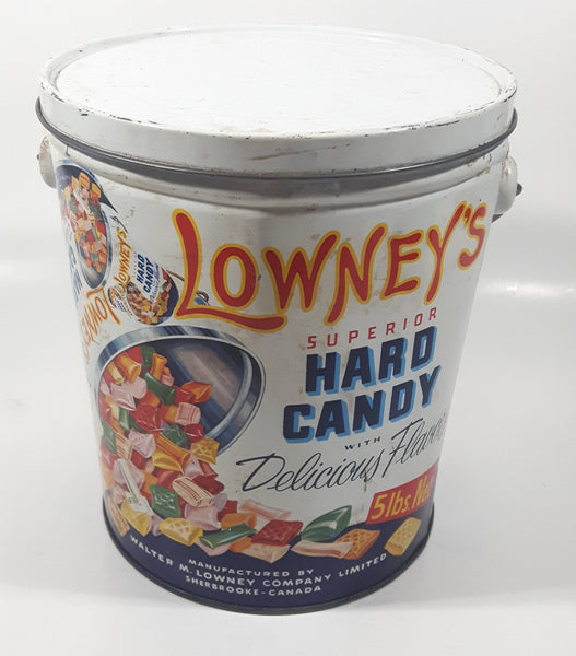 Antique Lowney's Superior Hard Candy with Delicious Flavors 5 Lbs Tin Metal Can Pail with Lid Sherbrooke, Quebec, Canada