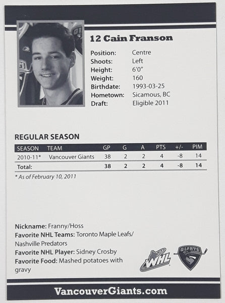 2010 2011 WHL Vancouver Cain Franson #12 C 2 1/2" x 3 1/2" Paper Card Signed Autograph