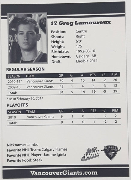 2010 2011 WHL Vancouver Giants Greg Lamoureux #17 C 2 1/2" x 3 1/2" Paper Card Signed Autograph