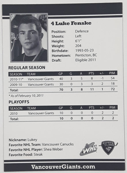 2010 2011 WHL Vancouver Giants Luke Fenske #4 D 2 1/2" x 3 1/2" Paper Card Signed Autograph