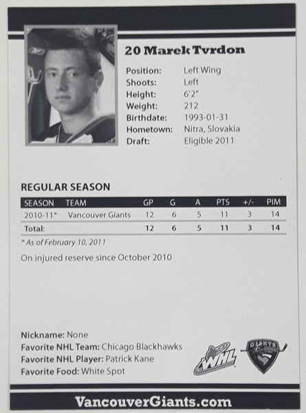 2010 2011 WHL Vancouver Giants Marek Tvrdon #20 LW 2 1/2" x 3 1/2" Paper Card Signed Autograph