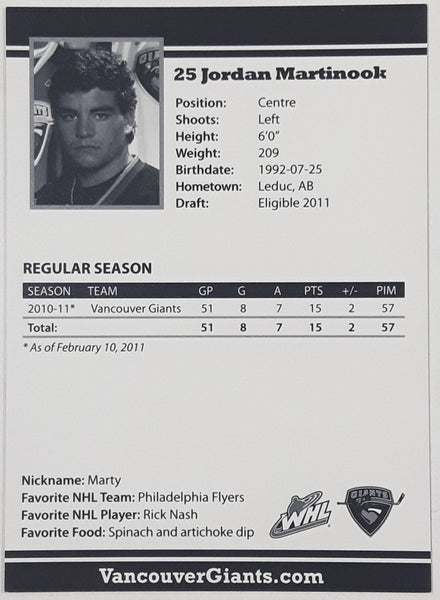 2010 2011 WHL Vancouver Jordan Martinook #25 C 2 1/2" x 3 1/2" Paper Card Signed Autograph