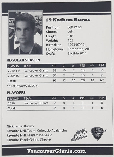 2010 2011 WHL Vancouver Nathan Burns #19 LW 2 1/2" x 3 1/2" Paper Card Signed Autograph
