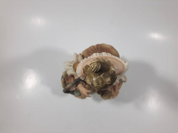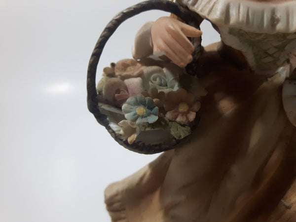 Three finger tips are broken off and one of the flowers in the basket is chipped. No cracks. Still has the original sticker on the base. View photos.