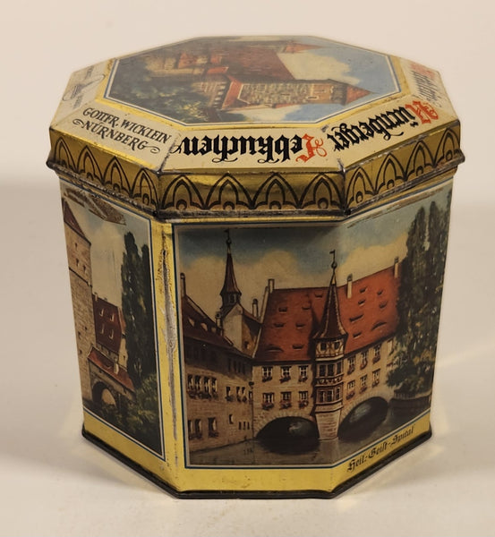 Vintage German Nurnberger Lebkuchenfabrik Gottfr Wicklein Nurnberg Octagonal Hinged Tin Metal Container