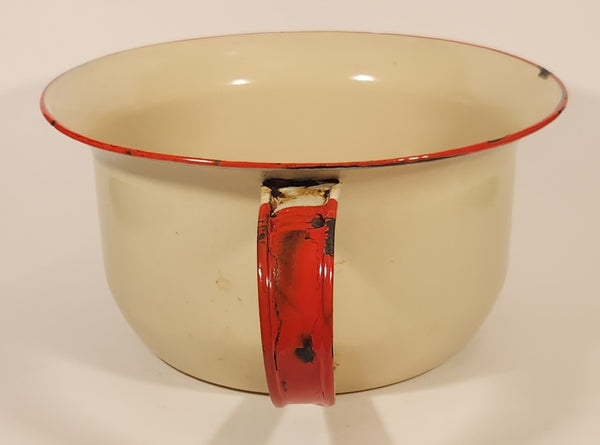 Antique Red Rimmed Cream 9 1/2" Porcelain Enamel Metal Pot with Handle