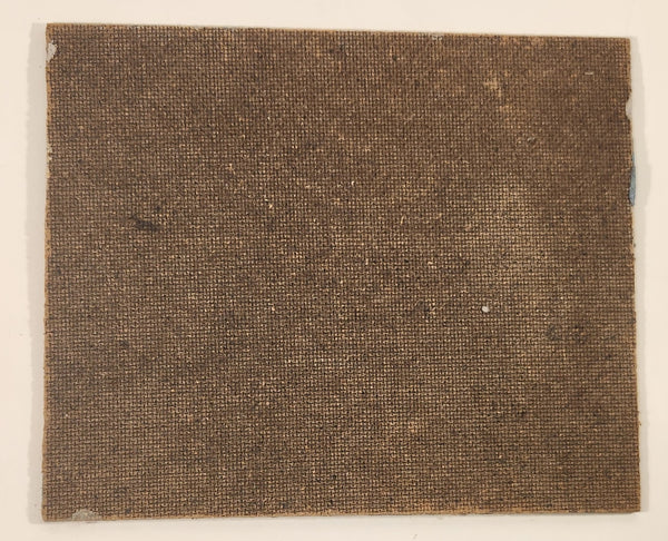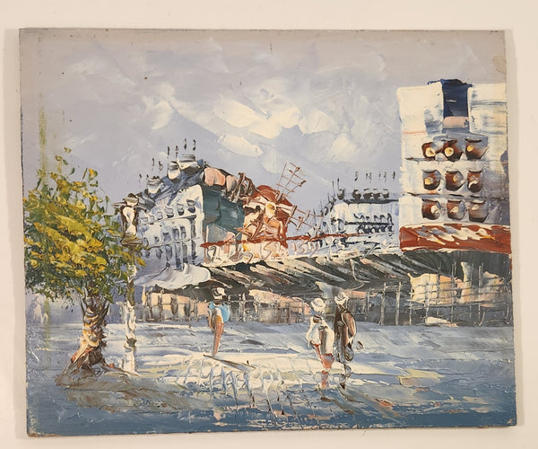 Buildings and Windmill with People Original 7 3/4" x 9 1/2" Hand Painted Oil Paint On Brown Hard Board