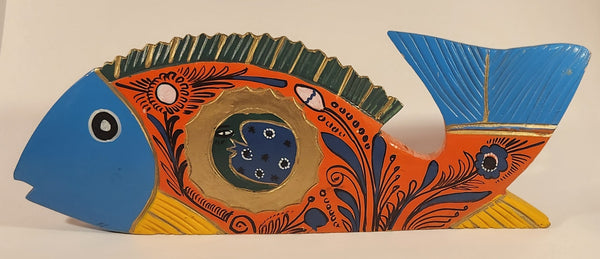 Vintage Mexican Folk Art Tropical Fish Blue Orange Gold Hand Painted 17" Carved Wood Sculpture