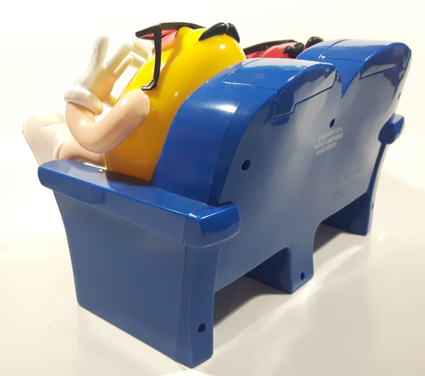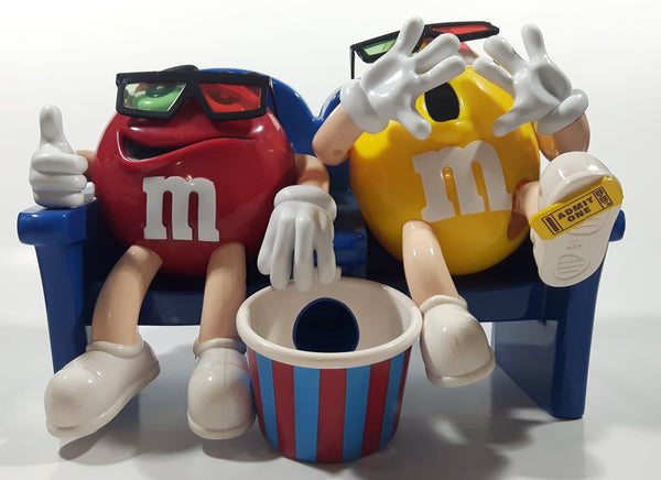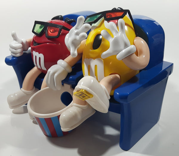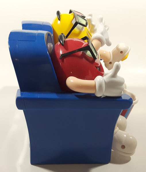 1999 M & M's Red And Yellow Character Sitting In Movie Theater Chairs Eating Popcorn Wearing 3D Glasses Plastic Candy Dispenser Machine