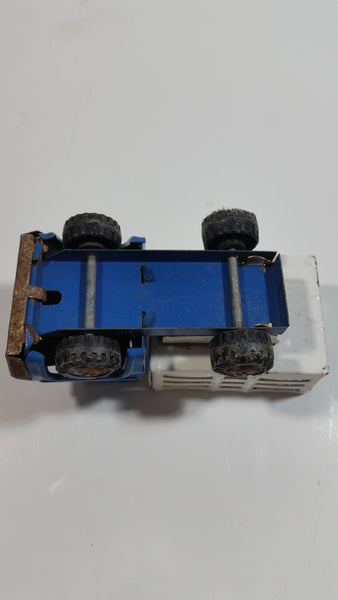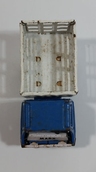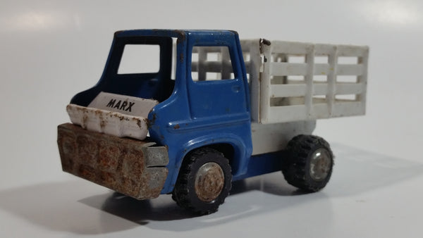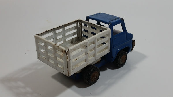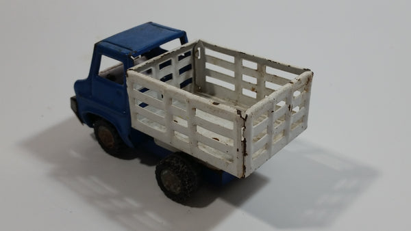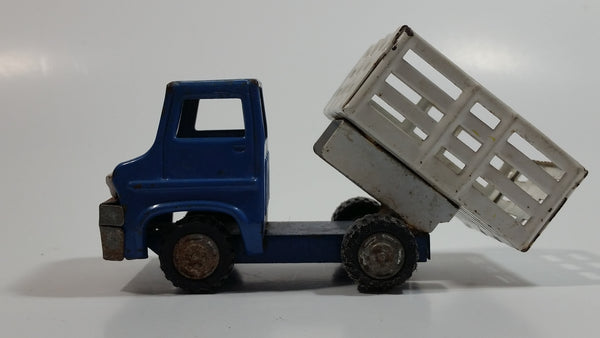 Vintage 1960s Louis Marx Blue and White Stake Bed Dumping Farm Truck Pressed Steel Toy Car Vehicle