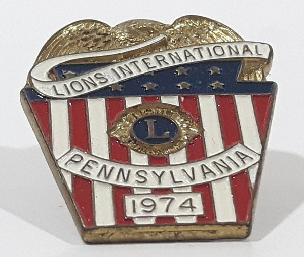 Vintage 1974 Lions Club International Pennsylvania Bald Eagle on Top of American Flag Banner Themed 7/8" x 1 1/8" Enamel Metal Lapel Pin