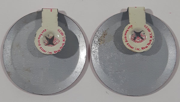 Vintage Go Mod Pink with White Letters Fold Over Style 1" Metal Tab Clip Pin Set of 2