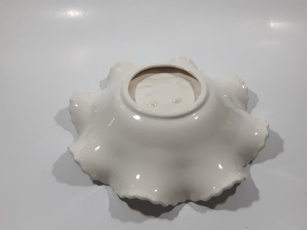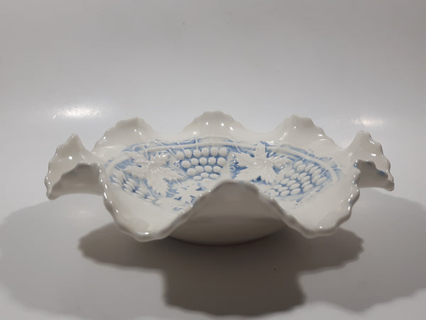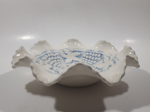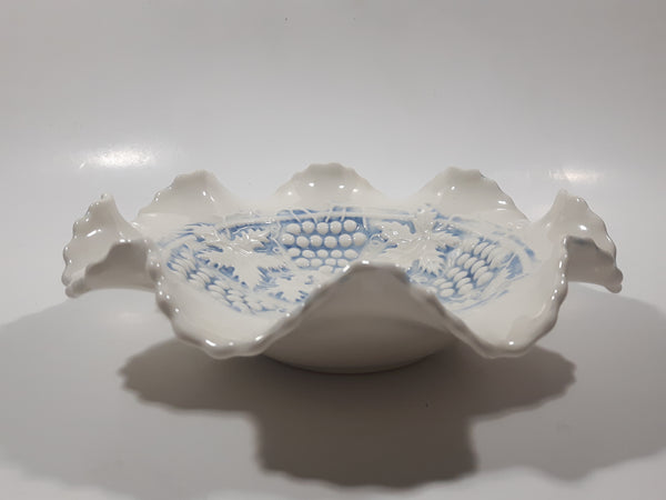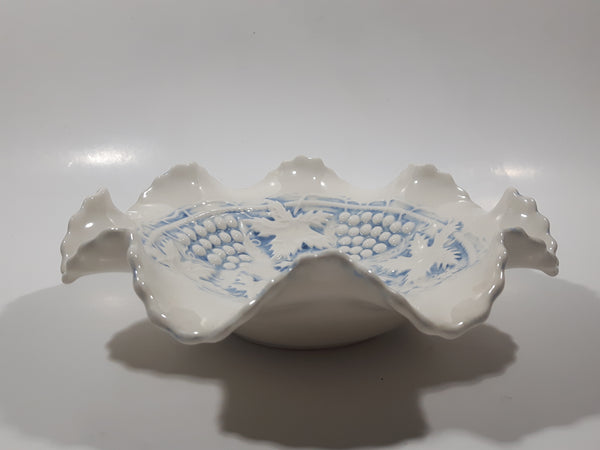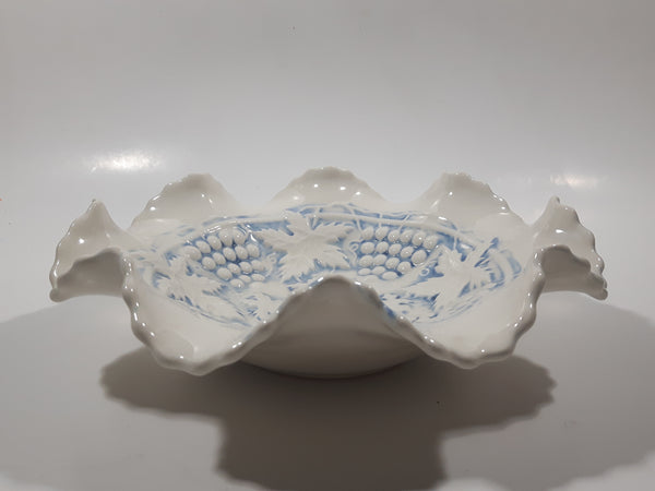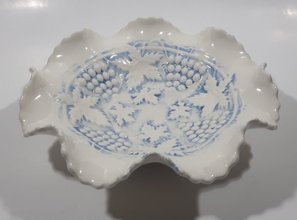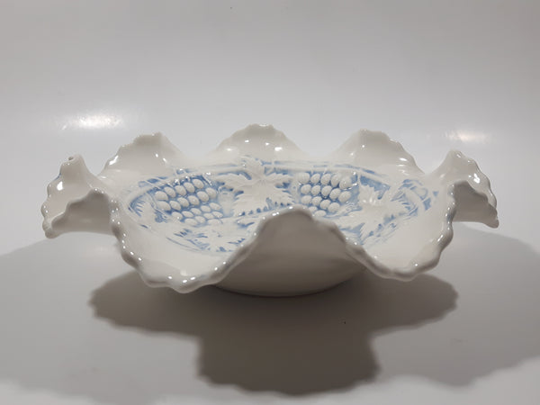 Vintage Grapes and Maple Leaf Pattern Embossed White and Blue Waved Frilled Edge 8" Ceramic Table Center Piece Candy Dish Bowl