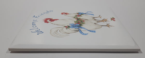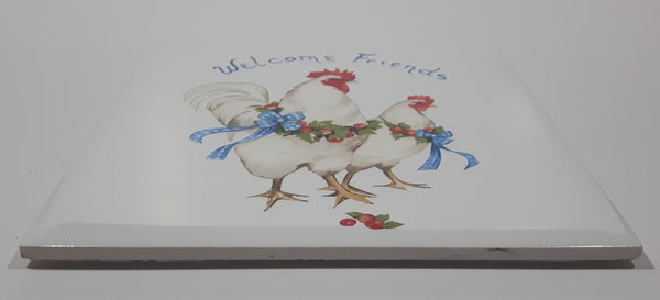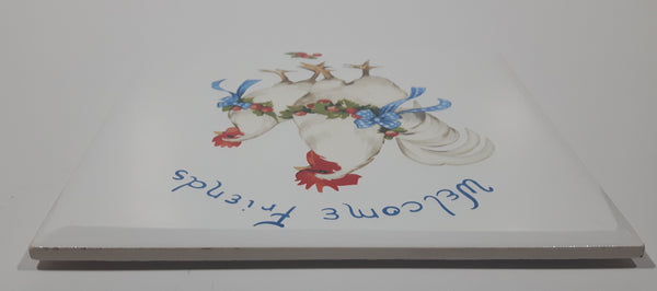Vintage Welcome Friends White Chicken Hens with Blue Bows Themed 6" x 6" Ceramic Tile Trivet