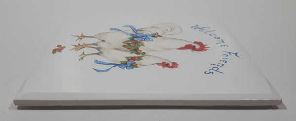 Vintage Welcome Friends White Chicken Hens with Blue Bows Themed 6" x 6" Ceramic Tile Trivet