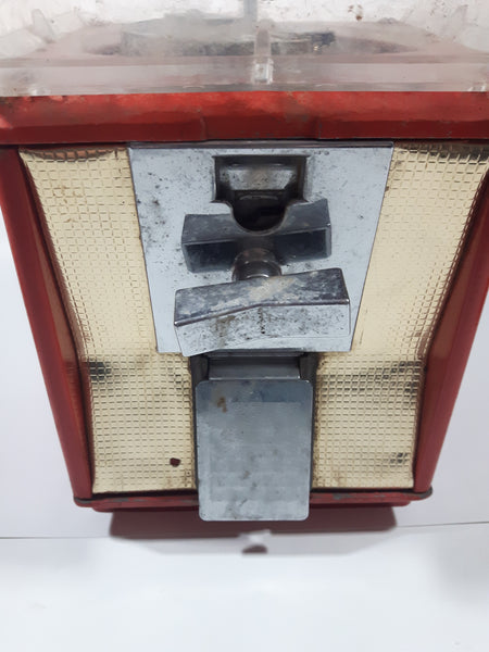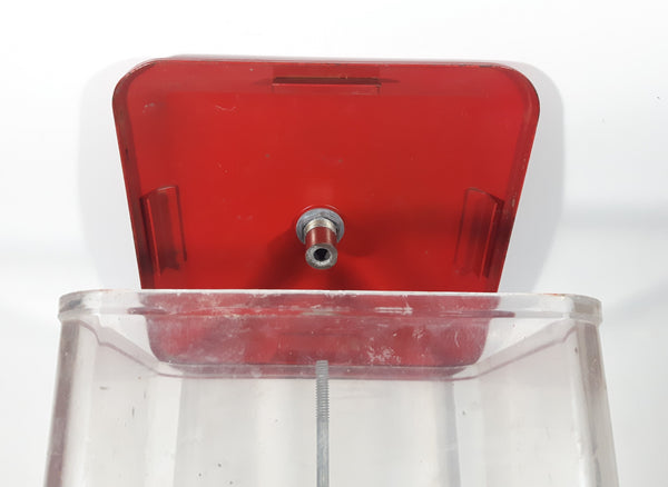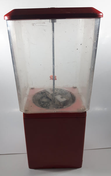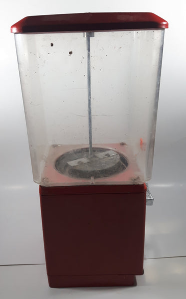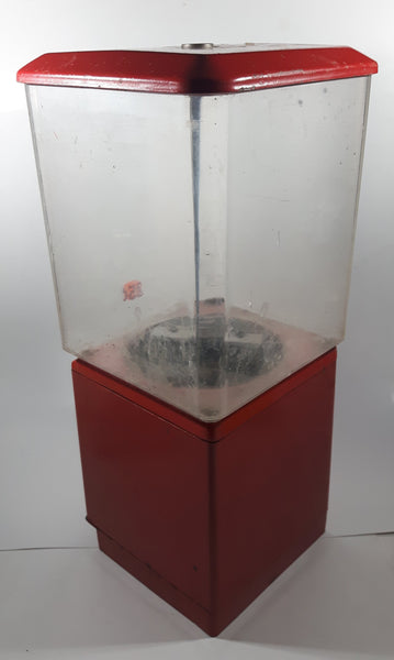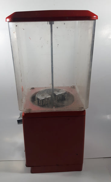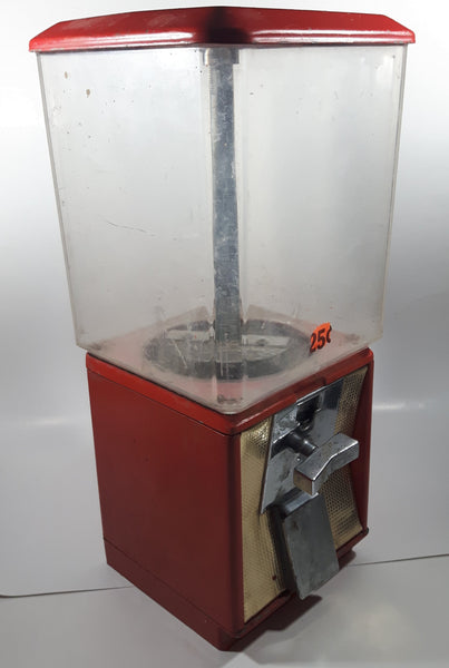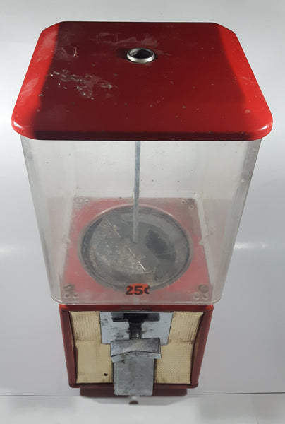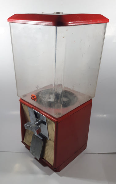 Vintage 25 Cent Heavy Red Metal 17 1/2" Tall Gumball Vending Machine Dispenser with Plastic Candy Bin