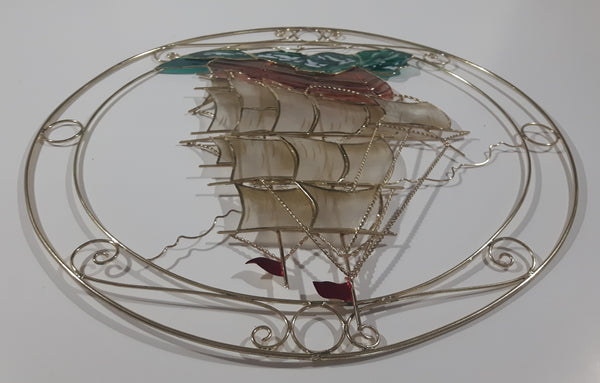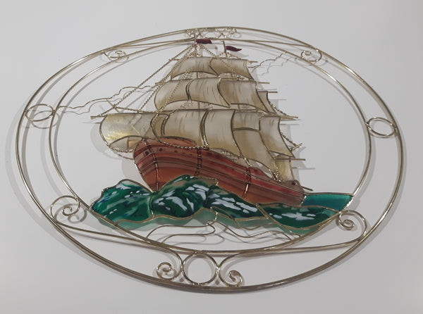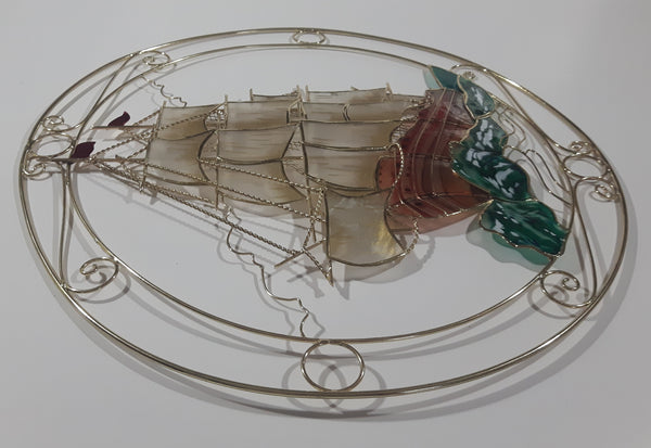 Beautiful Brass Metal and Plastic Stained Glass Style Colorful Tall Ship Sail Boat 13" Wall Hanging