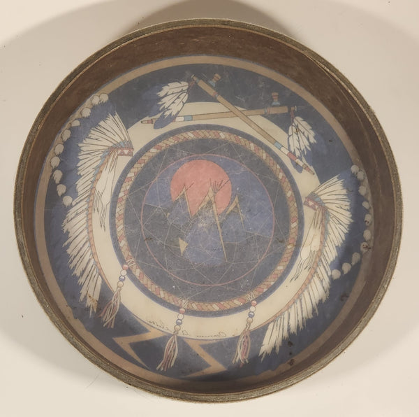 Clarence A. Wells Port Simpson, B.C. Aboriginal Art Blue and White Head Dress with Teepees In Sunset Hide Rimmed Drum Print