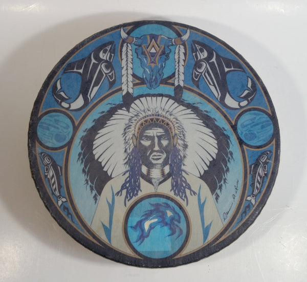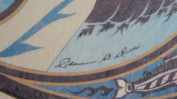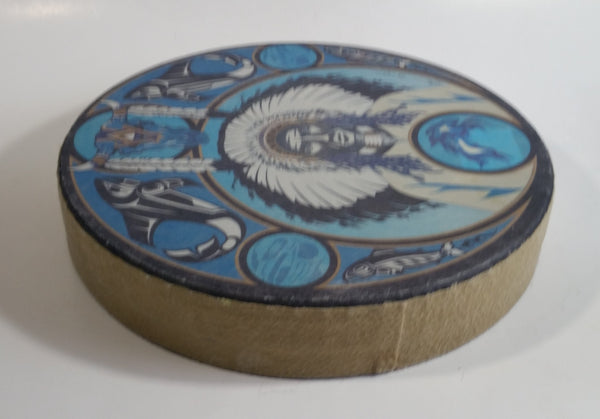 Rare Version Clarence A. Wells Port Simpson, B.C. Aboriginal Art Chief with Orca Whales, Salmon, and Buffalo Skull Blue Tone Deer Hide Rimmed Drum Print