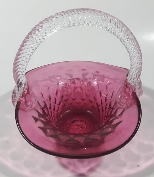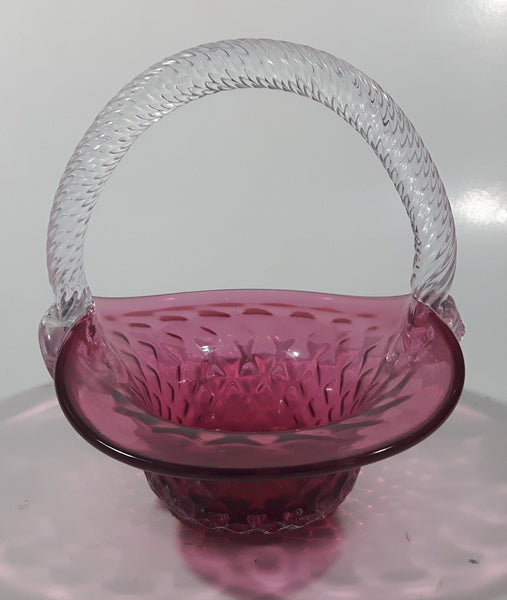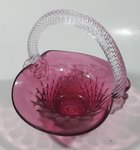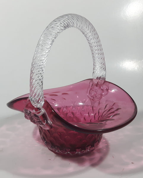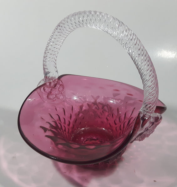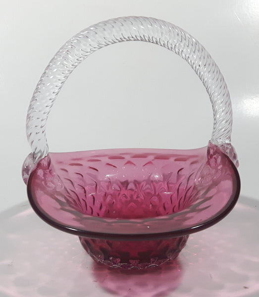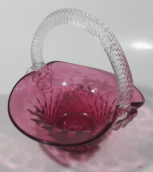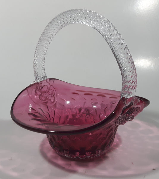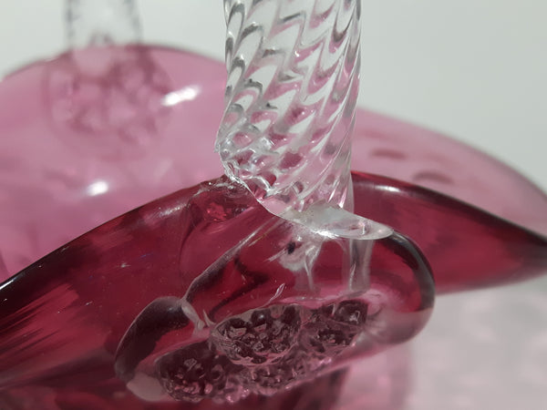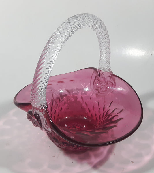 Vintage Rossie Clear Braided Handle Pink Cranberry Embossed Berries 6" Art Glass Basket Shaped Candy Dish