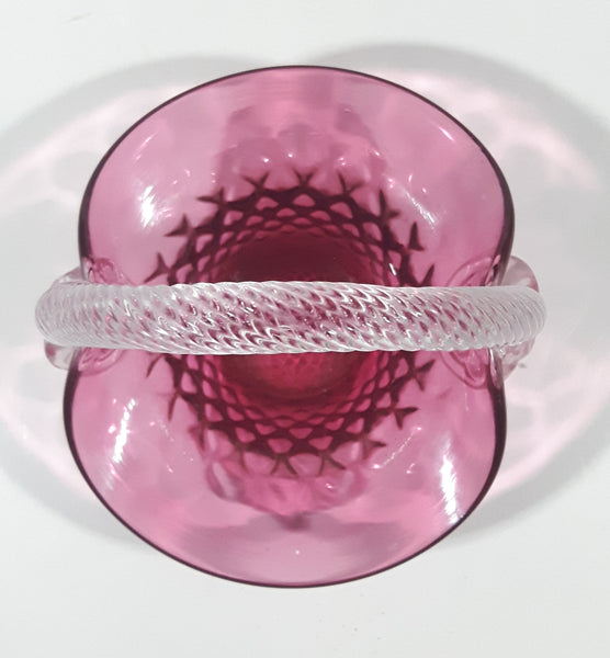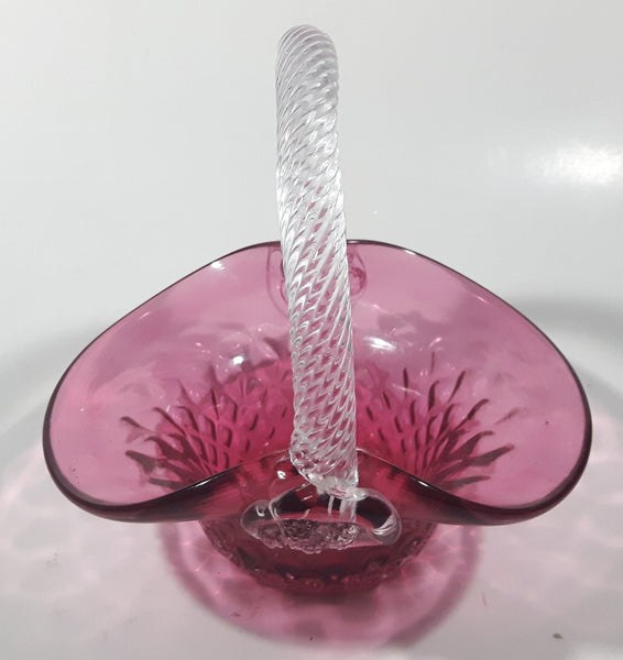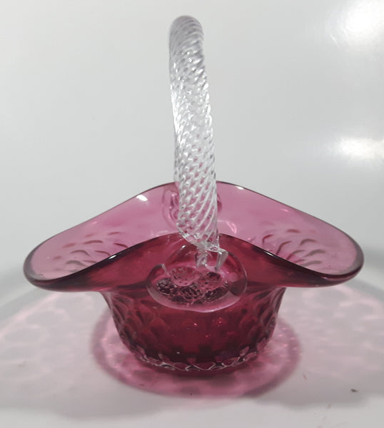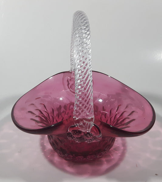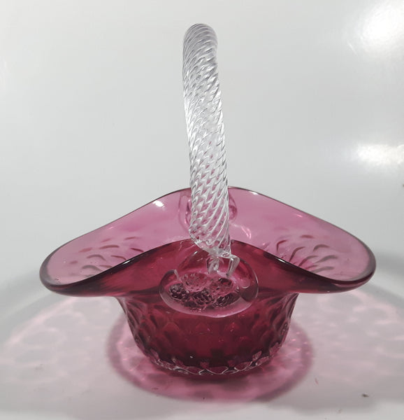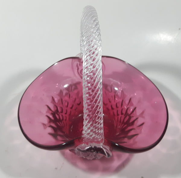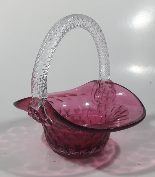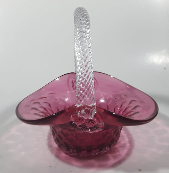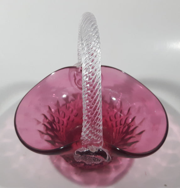Vintage Rossie Clear Braided Handle Pink Cranberry Embossed Berries 6" Art Glass Basket Shaped Candy Dish