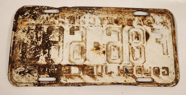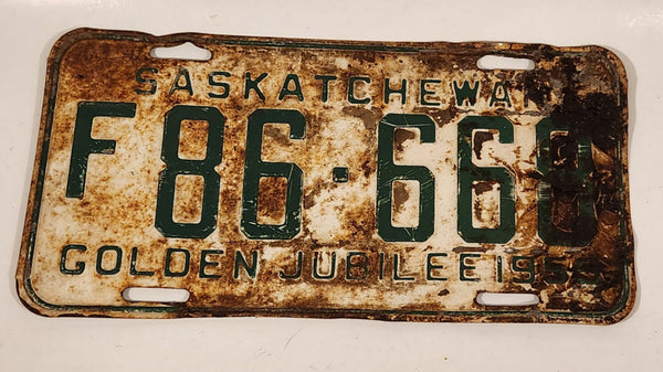 Vintage 1955 Saskatchewan Golden Jubilee Farm Vehicle Green Lettering White Vehicle License Plate Metal Tag 86 668