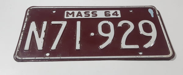 Vintage 1964 Massachusetts White Lettering Maroon Vehicle License Plate Metal Tag N71 929