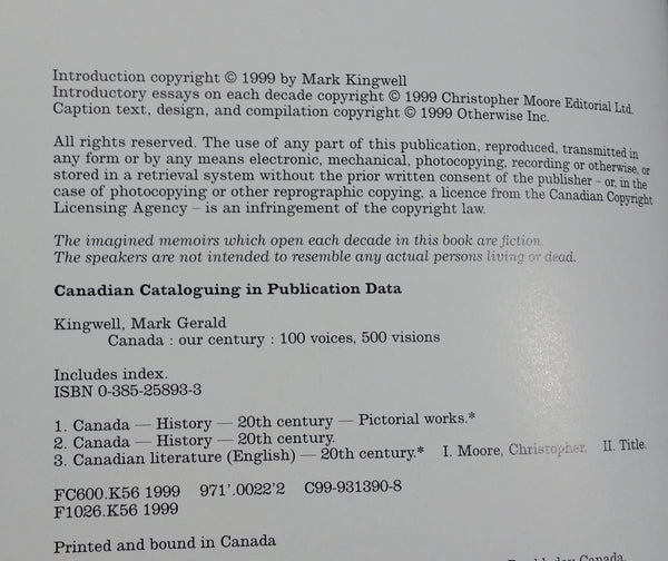1999 Canada Our Century 100 Voices 500 Visions Hard Cover Book by Mark Kingwell and Christopher Moore - Double Day Canada