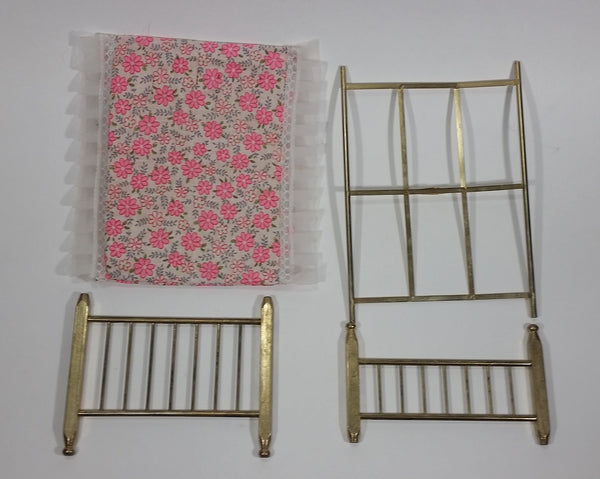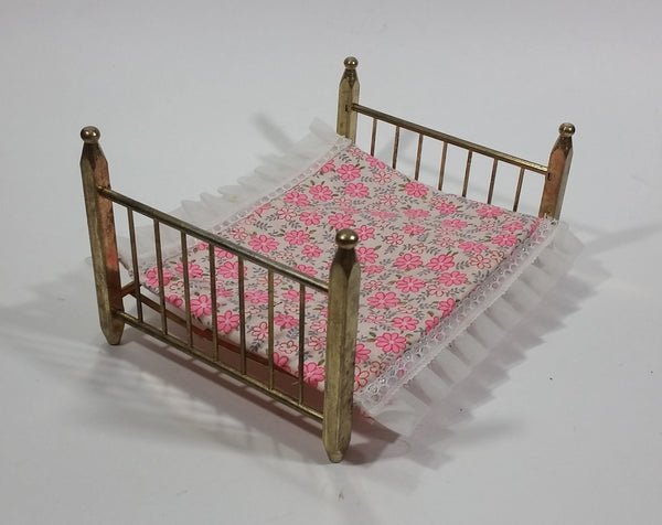 Vintage Brass Metal Doll House Bed Miniature With Thin Pink and White Mattress - Made in Taiwan