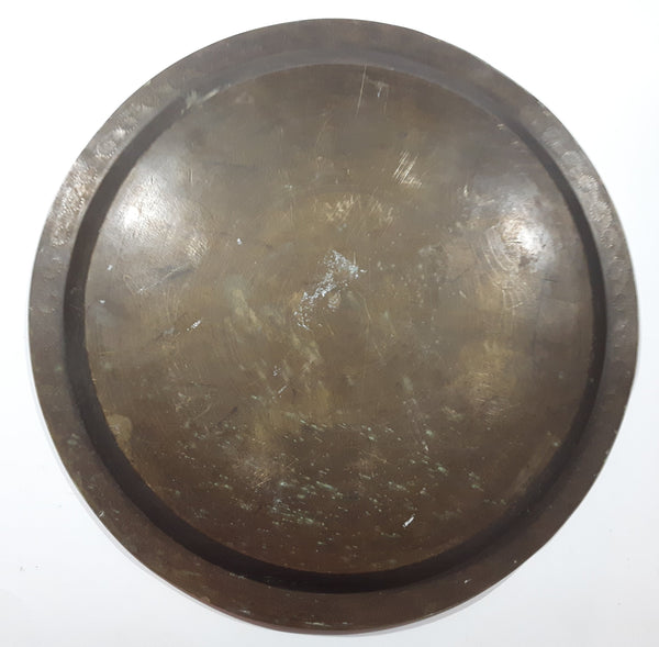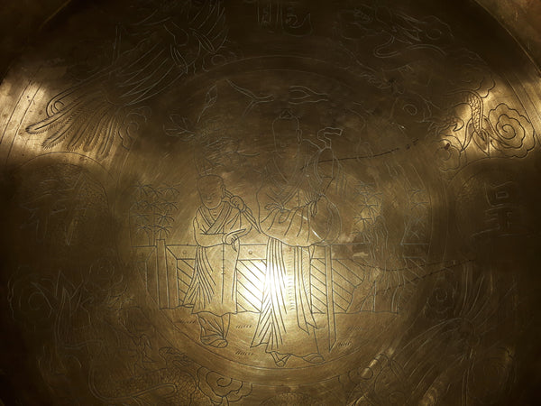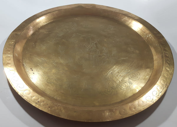 Vintage Japanese Man with Cane and Young Boy Large 17 1/4" Etched Brass Platter Plate