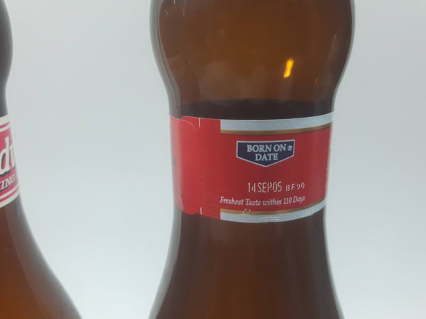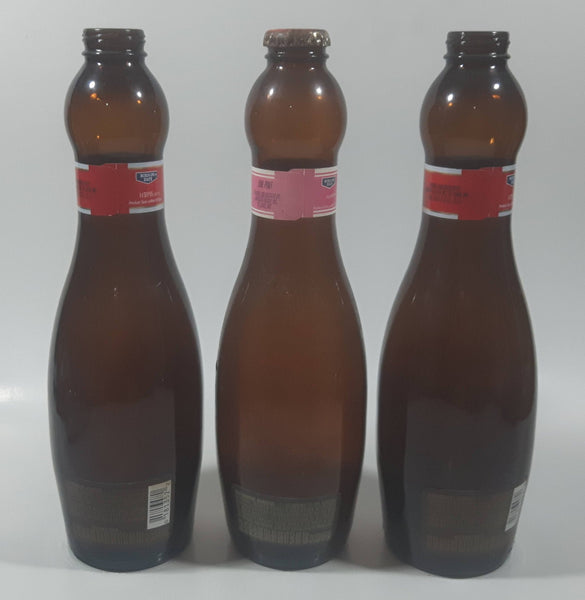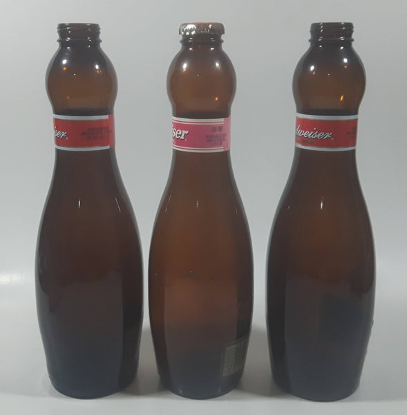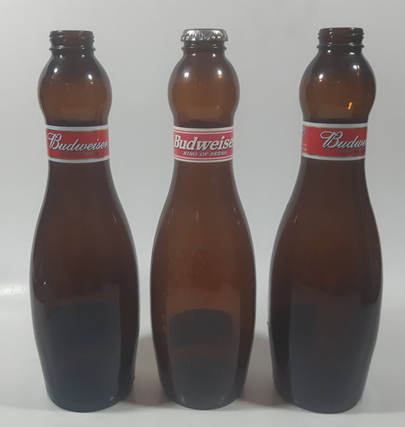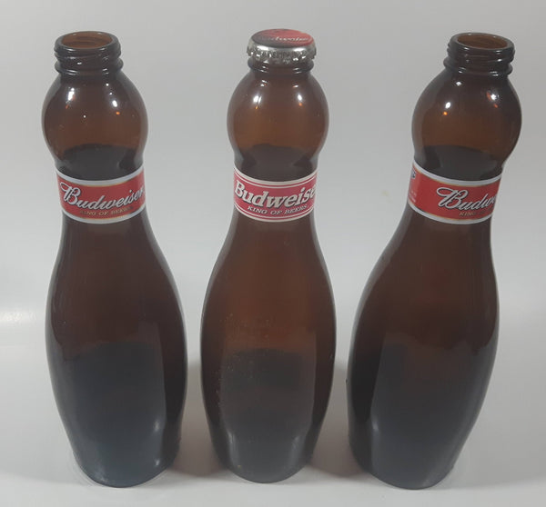 Budweiser King of Beers 9 1/2" Tall 1 Pint Bowling Pin Shaped Amber Glass Beer Bottle with Born on Date Set of 3
