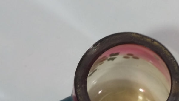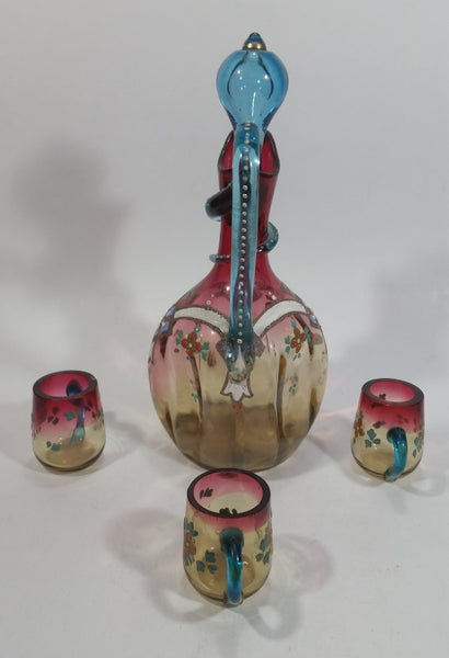 Antique Colored Art Glass Enamel Hand Painted Cruet Decanter With Stopper and 3 Glass Cups