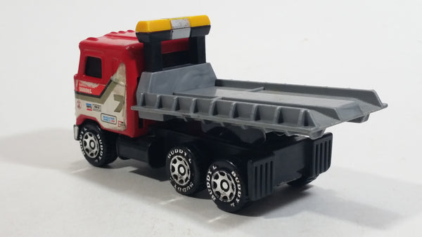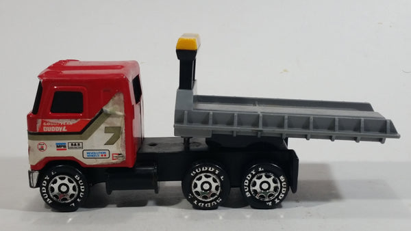 Vintage 1980 Buddy L Mack Semi Good Year #7 Flatbed Tow Truck Red and Grey Pressed Steel and Plastic Toy Car Wrecking Salvage Vehicle - Macau