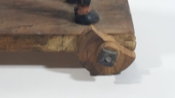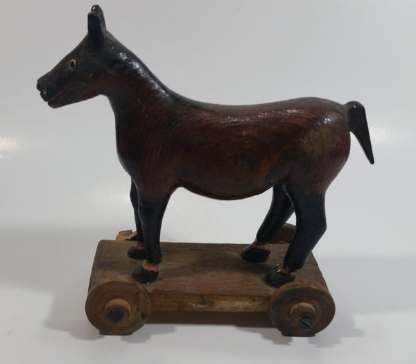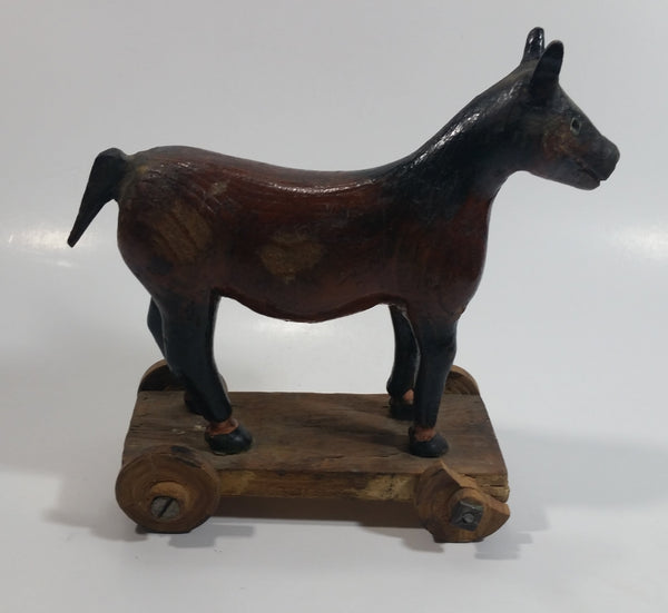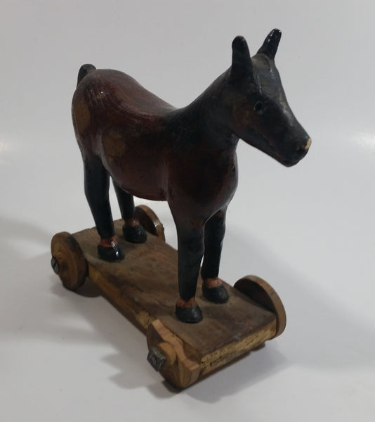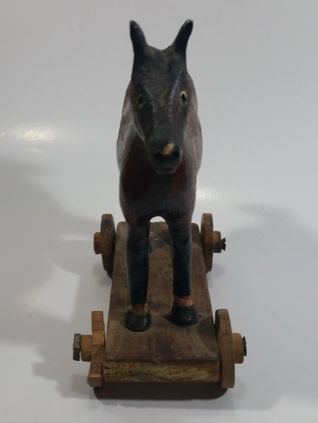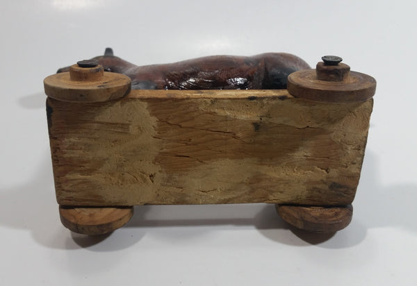 Antique Primitive Folk Art Wooden Horse on a Cart Carving with Wooden Wheels 7" Tall Carved Statue