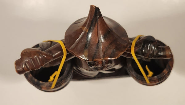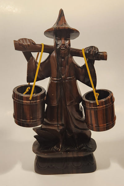 Chinese Man Carrying Buckets Carved Wood Sculpture