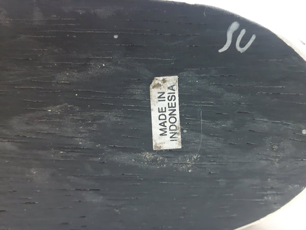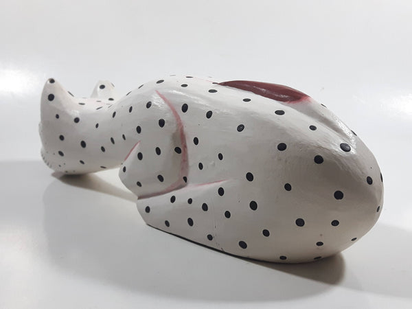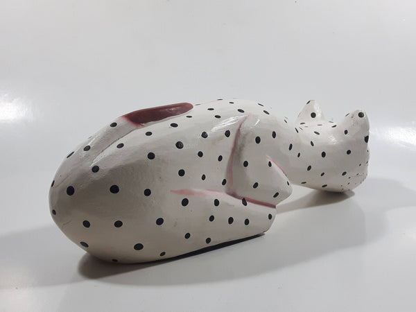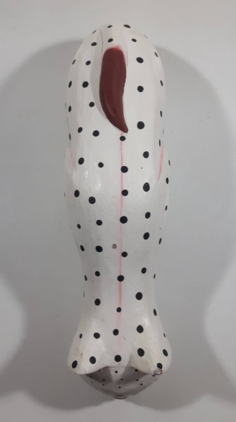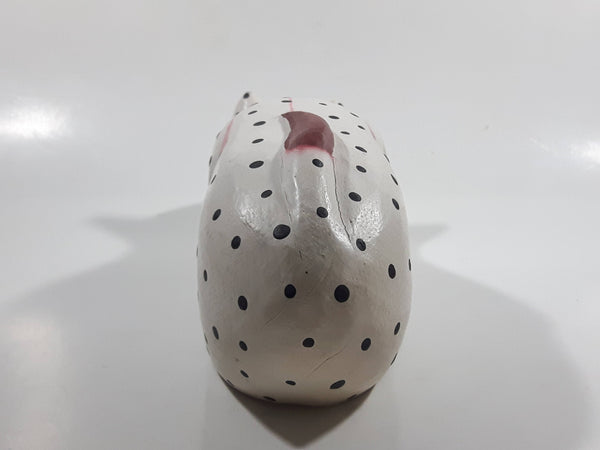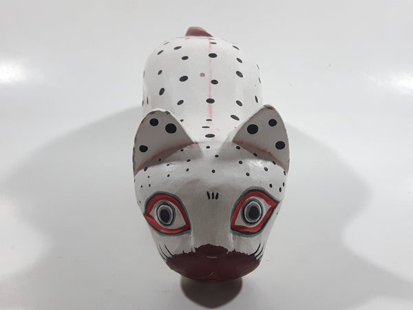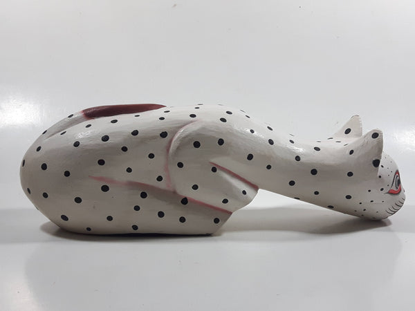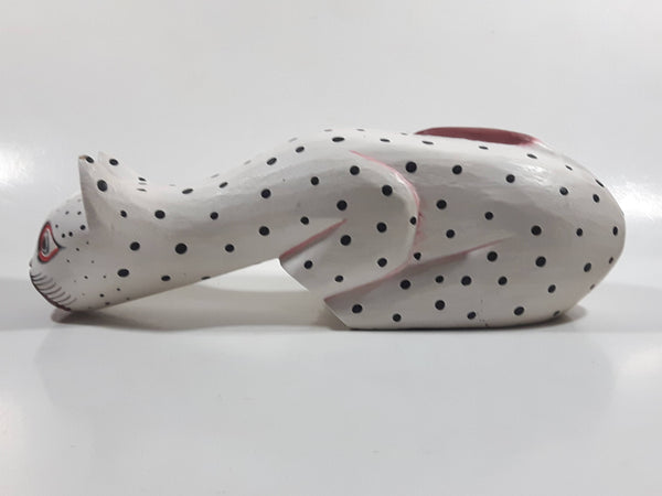 Indonesia Hand Painted White Black Spotted Wooden Carved Cat Sculpture Leaning off Table