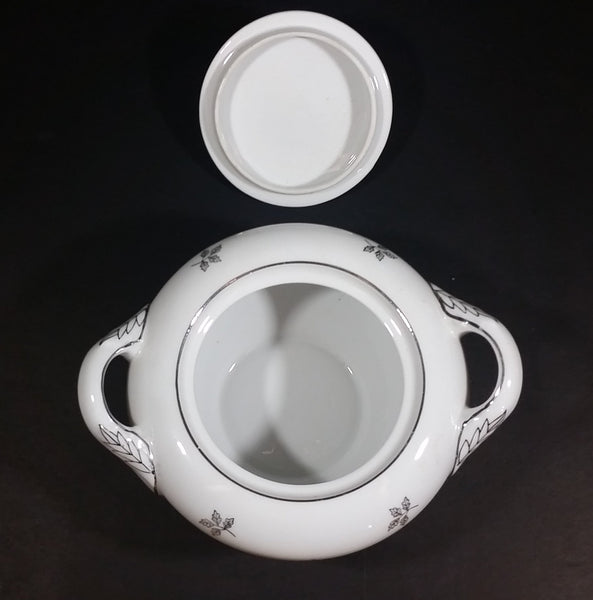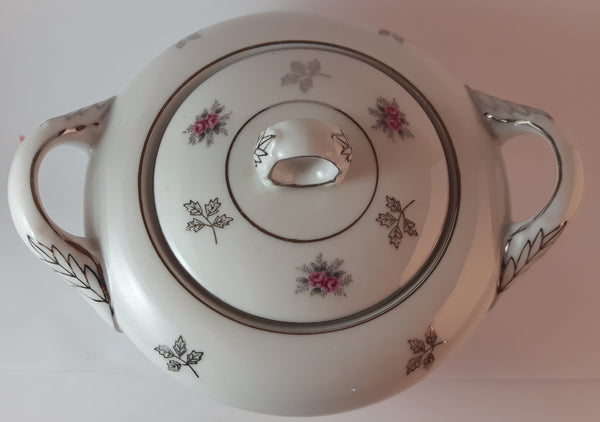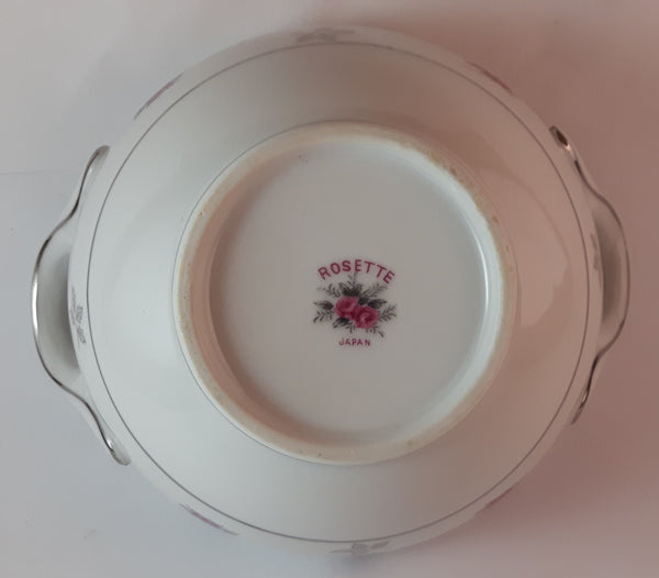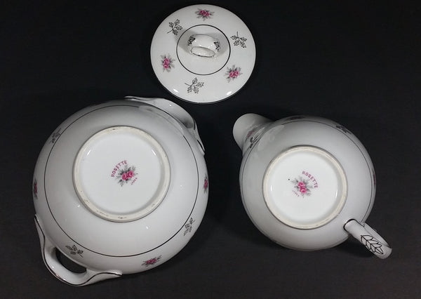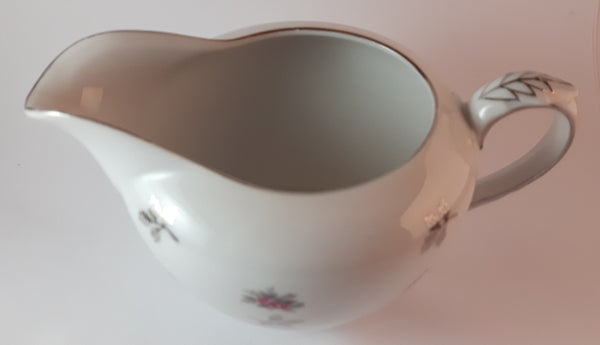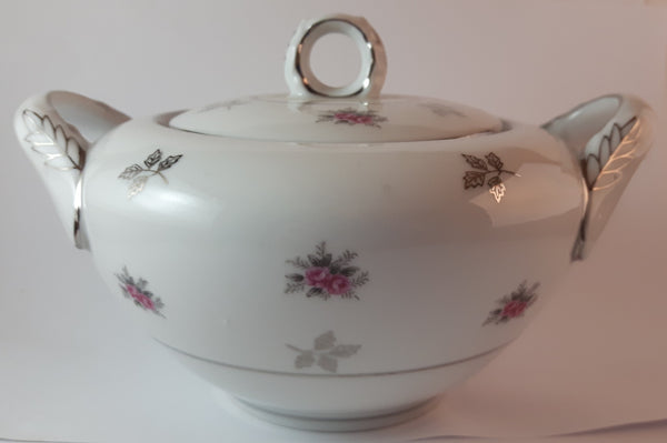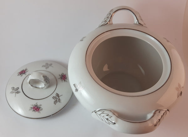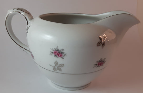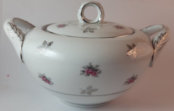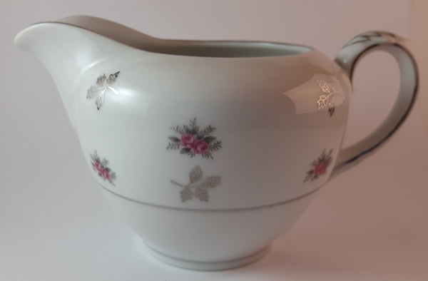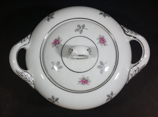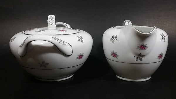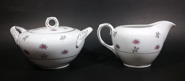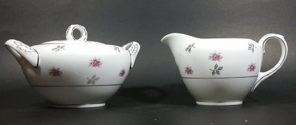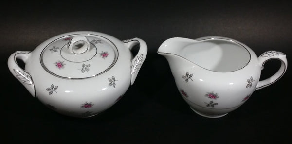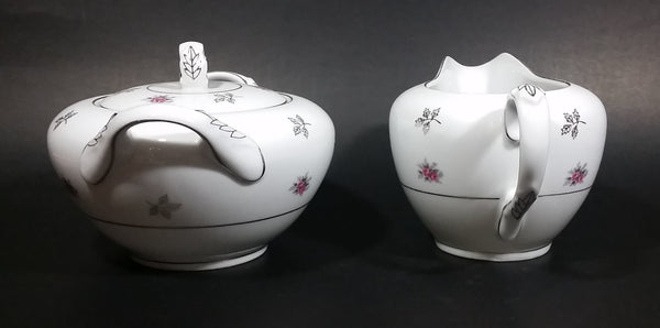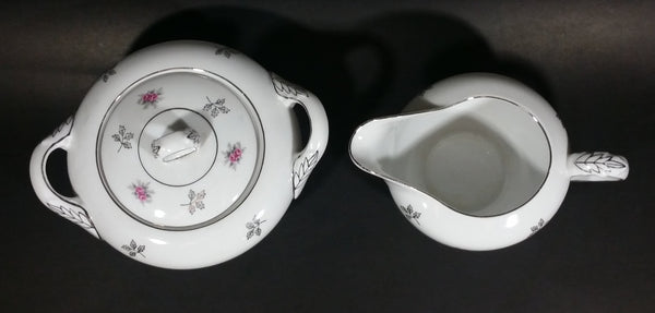 1970s Japan Rosette in Pink Floral with Silver Leaves and Trim Creamer and Sugar Bowl w/ Lid Porcelain Set