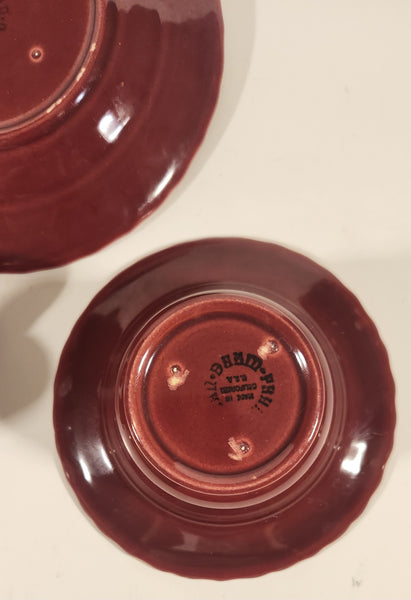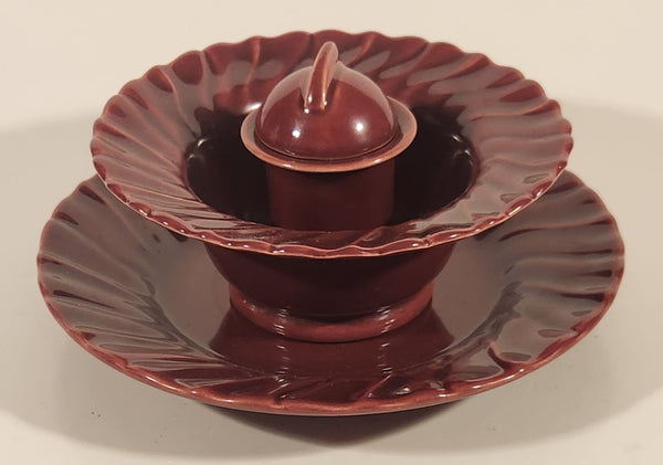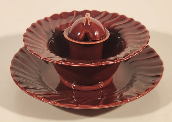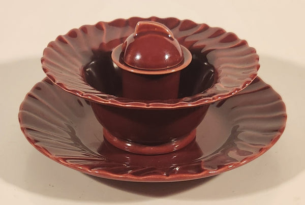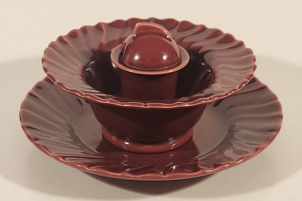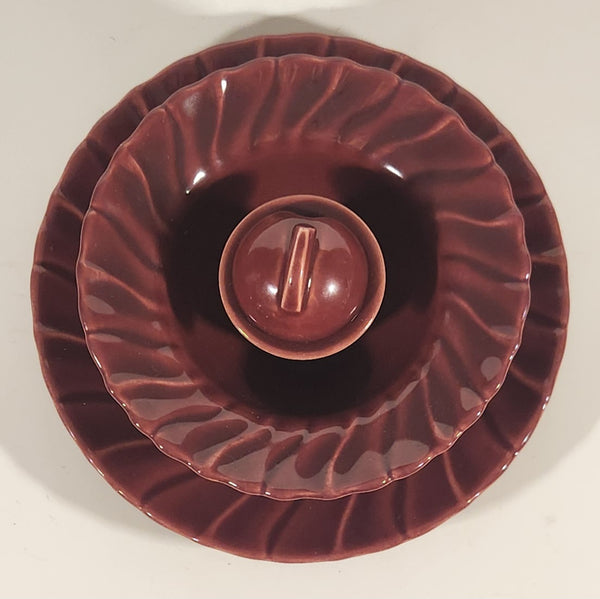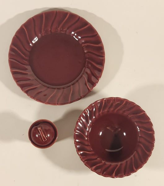 Antique 1930s Franciscan Ware Coronado Swirl Dark Red Burgundy Maroon Sauce Plate Sauce Bowl and Soy Sauce Pourer with Lid Dish Set