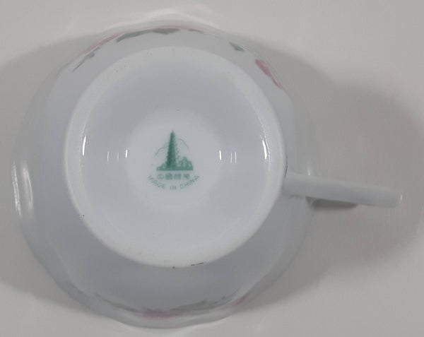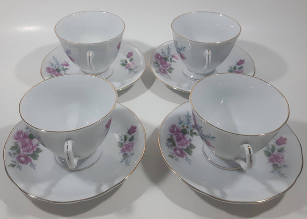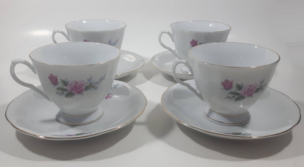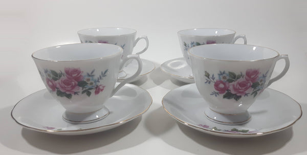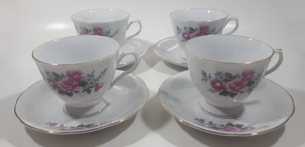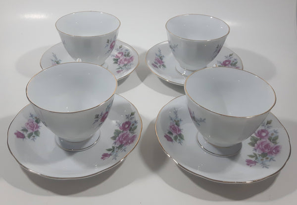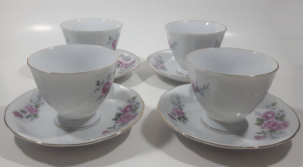 Pink Roses White with Gold Trim Fine China Tea Cup and Saucer Set of 4
