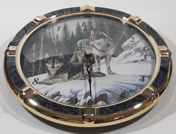 1991 Terry McLean Wolf Themed Painting 11 1/2" Round Faux Wood and Plastic Brass Wall Clock