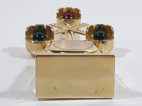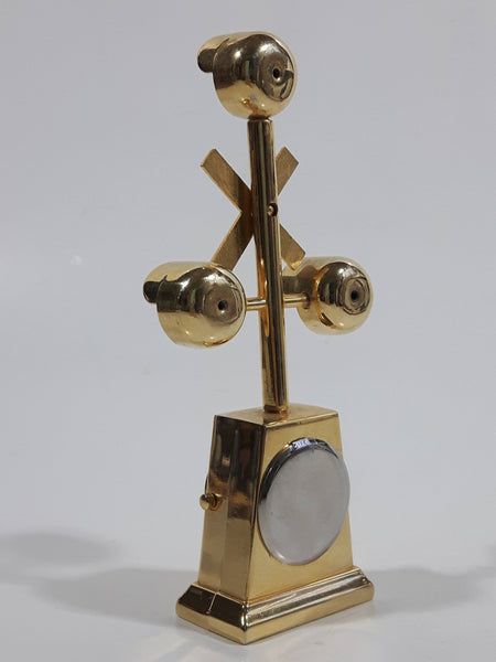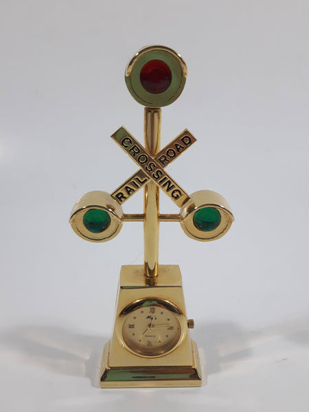 My's Railroad Crossing 4 1/2" Tall Gold Tone Metal Miniature Quartz Clock - Needs A Battery