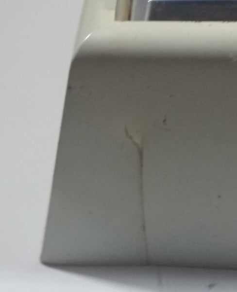 Large crack in the cover near the top. Small crack in the cover near the center. Small crack on edge of the case and there is a couple of tabs broken off. The cover still holds. Nice big size. Tested and working. View photos.